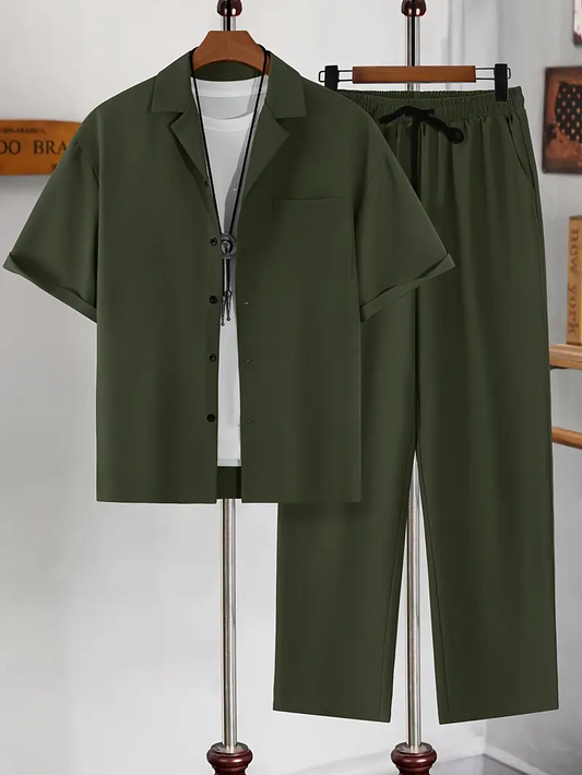 Men's Army Green Casual Suit-Inspired Shirt & Pants Set