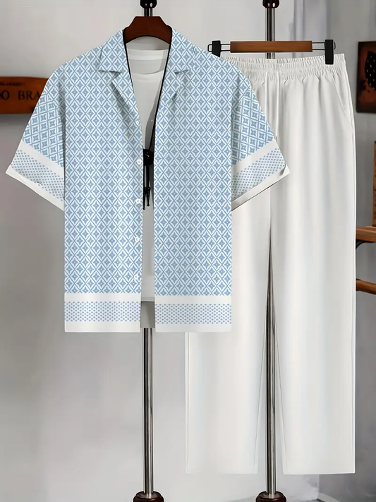 Men's Blue & White Printed Suit-Inspired Shirt & Pants Set
