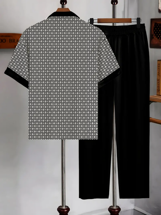 Men's Black & White Printed Suit-Inspired Shirt & Pants Set